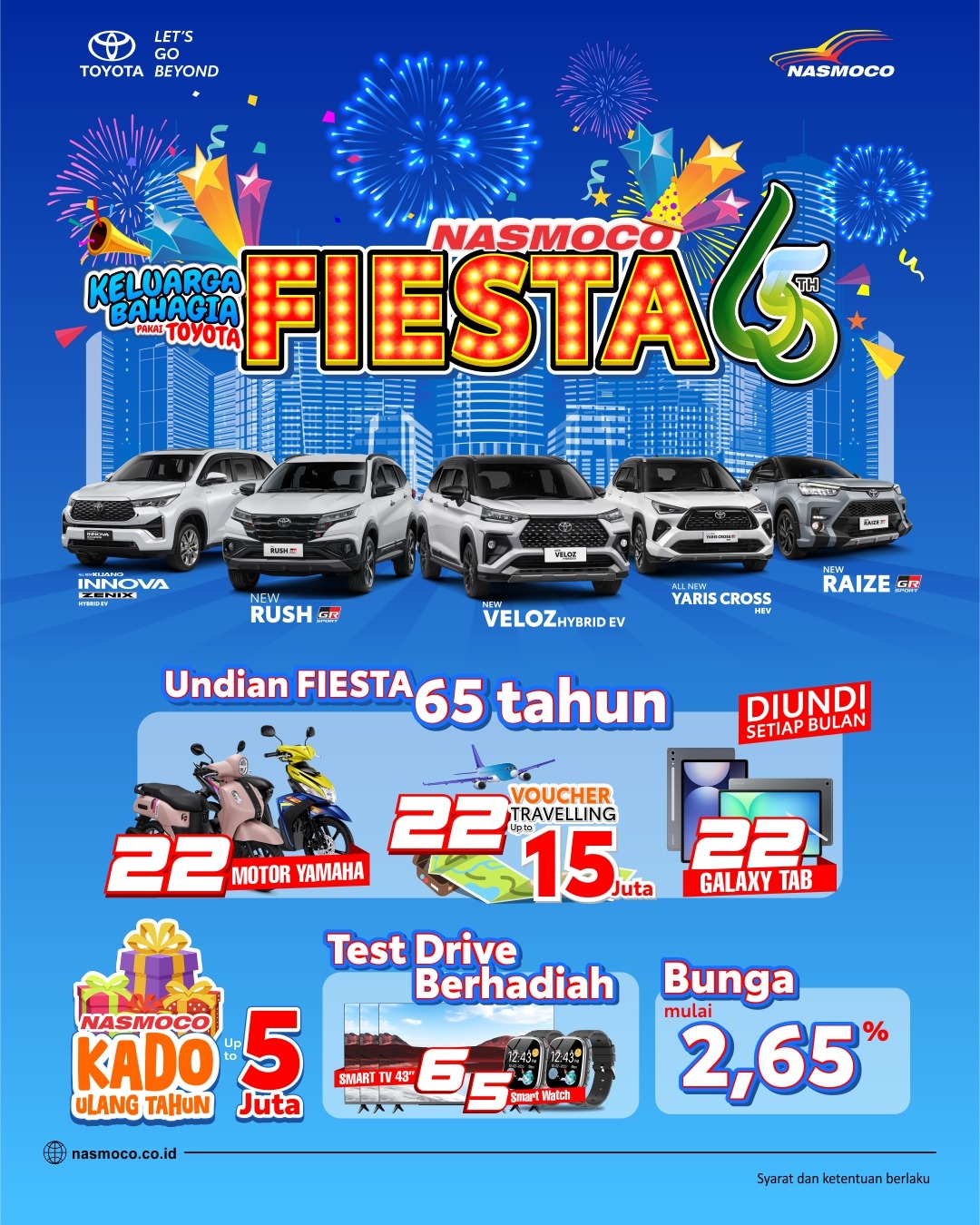 Semarak ulang tahun "NASMOCO FIESTA 65th" untuk Nasmoco Lovers yang beli Toyota sekarang dan bawa pulang kesempatan menang hadiah berupa: